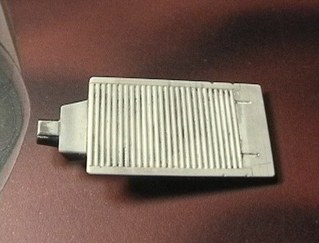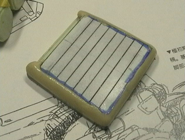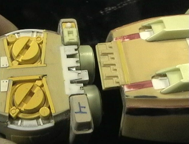 前後で27度可動させるために、ここで分割してます。 白い方がプラ板、そこにタミヤのエポキシパテを 押しつけて反対側を作ります。 簡単でしょ? |