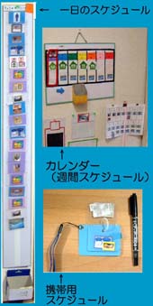 | 時間の流れを伝える 今から何があるのかを伝えるためにスケジュール ボードを使っています。悠くんの大好きな活動が、 いつあるのか(いつまで待てばいいのか)を示して あります。 お出かけの時も、いつでも悠くんに伝えられるよう に、また、悠くんがいつでも確認できるように、携 帯用のものを持ち歩いています。 |