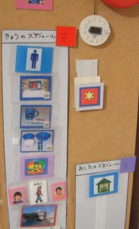 一日の流れを伝えるボード (スケジュールボード) ![]() ボードの下のボックスに、写真カードが 入っています。 |