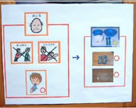 | お約束シートにたどり着くまで・・・【悠くんの噛み付き】 悠くん、小さい頃はいつ噛み付くか解らない、野獣状態でした。 写真でコミュニケーションが取れるようになり、スケジュールなどの理解で見通しも持てるようになってきて、噛み付きがほとんどなくなりました。 でも、今でも、頻度は多くはないですが、パニックを起こしたときには、引っかいたりします。 ある日のプレイセラピーで、STの先生に突然攻撃を始めたようです。 STの先生は、「いつもは原因が推測できるのだけど、今日は突然で、全く原因がわからない」と言うことでした。 部屋の中での様子を順を追って聞いてみたのですが、課題をひとつ終えたら、リラックス時間という組み立てで、悠くんのペースでやってくれています。 リラックスタイムも、跳び箱の上に座って足でリズムを取りながら、ビニールとゴルフボールを触っているらしく、今日もいつものようにそうしていたようです。 最後の課題を終えて、リラックスタイムの最中に、突然ゴルフボールを窓に向かって投げつけて、先生に攻撃を向けたようです。 そのときの声かけのタイミングなど、いろいろパニックの引き金になりそうなことを聞いてみましたが、思い当たらないということでした。 かなり悠くんの様子を的確につかんでいる先生ですので、本当に何もない状態からのパニックだったようです。2年間その先生のところに通っていますが、初めて見せた悠くんの突然攻撃に、先生も驚いておられました。 これは、私の推測ですが・・・ 課題も全て終わって、後少しで今日のセラピーも終わりになるということは、スケジュールからも、時計の提示からも、悠くんには情報としてわかっています。 もっと遊びたいけれど、もうすぐ終わらないといけないと言う状態で、悠くんが一番恐れているのは、「今日は終わりね」という終わりの宣告です。 もうすぐ遊びを終わらなくてはいけない・・・でも、もっと遊びたい・・・でも、時間が来たら終わらなくてはいけないことを十分に理解している・・・そういう状態の悠くんに、その宣告の時間が近づいてきた。 終わりの宣告を聞きたくない悠くんは、その宣告が来る前に、パニックになってしまいました。 こんなことが、たまにあります。 環境の側を整えることには限界があります。 悠くんが、パニックを起こさなくていいような環境を、私でも常に提供できません。 では、この引っかき攻撃を今後どうしていくか・・・年に数回しかなくても、ゼロでないかぎり、一人で行動させることは出来ません。 環境を整えられないなら、悠くんが、「自分でその感情を処理する方法」を身に付けさせることを考えないといけません。 ふぅーーーー、私にとっては、大きな課題です。 ◎いらいらしたするまえに、または、引っかきたくなる前の段階で、気持ちを表出し、解消で きるような、コミュニケーションの方法を考える。 →過去の経験から、もっと遊びたい要求が通らないことは解っているので、無理だろうなあ・・・ ◎「感情を抑える」ということは無理ですので、自分で人から離れた静かなところに行って、 そこでポケットからハンカチを出して、ハンカチにイライラをぶつけて解消する。 →とりあえず、この方向に考えようかなぁ・・・ と思いましたが、落ち着くまでに壁や窓ガラスを叩いたり激突したりします。 危険な窓がないところだけしか使えません。 我が家は・・・マンション。 隣や階下のお宅に、とってもご迷惑ですね(^^ゞ ◎動機付けの導入 →やっぱりこれしかないけど・・・ 「○○しなかったら、△△」って、動作や動詞を理解していない悠くんに伝えるのは とっても難しいです。 「→」も理解していないし・・・ ご褒美シールシステムの理解をさせたいのですが、「○○しない→シール→ご褒美」という複雑なシステムの理解はまだ無理です。まず「○○した→△△」を理解するために「→」の意味を理解させたいのですが・・・ ・・・とあれこれ悩んでいるときに、チャンス到来(^^) おやつまで待つのに、「タイマーをかけて」といつものように要求してきました。 タイマーがなるまでおやつが手に入らないことが解っていて、押さえられなくて、ひっかき攻撃を始めました。 今が「○○→(したら)△△」の意味理解してもらえるチャンス!!と思い、「ひっかき→おやつ×」と「ひっかき×→おやつ○」カードを目の前で作りました。 作っている最中にカードの意味を理解したのか、攻撃が収まり、悠くんが「ひっかき×→おやつ○」のカードを何回か示して要求してきました。 うーーーん、それにどう対応しようか。 我慢できたから「おやつ○」にしようか、確実に理解させるために「ひっかいたからおやつはなし」を通すか・・・ここですぐ「おやつ○」にしてしまったら、「ひっかいても、やめたらすぐにおやつ○になる」と思うかも・・・と、悩んでいる間に、悠くんがおやつをあきらめ