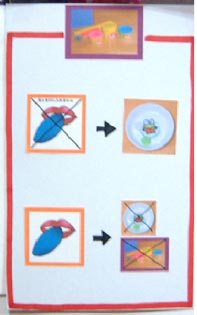 | 「粘土を口に入れません」 悠くんは、粘土遊びが大好きです。 ・・・といっても、粘土をこねたり、形を作ったりではなく、粘土の感触を楽しみます。 手で感触を楽しんでいるだけだといいんですが、一番すきなのは、口(^^ゞ なめて楽しむのが大好きなので困ります。 最初は、「お口はダメ!」とその都度叱っていました。 すると・・・サリーの背を向けて、口に入れているのが見えないようにしたり、サリーを遠くの方へ連れて行って「バイバイ」をしてから、粘土を口に入れるようになりました。 いくら叱っても、粘土を口に入れる行為はなくならず、返ってそのことに執着させてしまいました。 1年ぐらい、「粘土は禁止」にしてみたのですが、遊びが少ない悠くんの楽しみの一つである粘土を取り上げたままにするのは・・・と思い、再開しましたが、やっぱり口に入れます。 それで、動機付けをすることにして、それを視覚的に伝えました。 ![]() 「粘土お口×」→「ご褒美皿にのったコンペイトウ」という絵です。 「粘土を口に入れなかったら、ご褒美にこんぺいとうを食べれます。」ということです。 その下は、「粘土を口に入れたら、ご褒美がなしになるし、粘土もできないよ」と描いてあります。 粘土を口に入れそうになったら、「粘土を口に入れなかったらご褒美だよ」と伝えました。 さて、その効果は・・・・ 悠くん、粘土を口に入れたくなると・・・わざわざサリーに向かって、粘土を示しながら「あっあっ」・・・「ちゃんと遊んでるよ」とアピールしました。そして、口に入れるのを我慢できなくなりそうになると・・・自分から粘土をお終いにして「ご褒美」を要求しました。 叱るという罰を与えることは、ちっとも効果がなかったのに、動機付けをして視覚的にに伝えるだけでこんなにも効果があるとは思いませんでした。(^^ゞ |