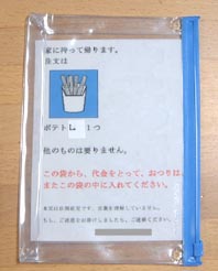 ◎課題分析 行動 評価 1.レジでビニールケースを渡す。 △ 2.ポテトの引換券とビニールケースをもらう。 △ 3.ポテトが出来るまで待つ。 △ 4.呼ばれたら引換券を渡してポテトをもらう。 △ 5.ポテトをかばんに入れる。 △ |