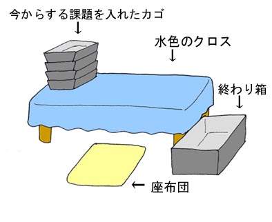 悠くんの座る位置には、座布団を置きました。 左側に今からする課題を1つずつ入れたカゴを積み、上から順に取り、終わったら 終わり箱に入れます。左のカゴがなくなるまで順にしていくことになります。 一番下のカゴには、「次に何をするか」の指示を入れます。 たとえば、粘土遊びなら粘土遊びを表すものを入れておきます。 本人が好きなものを勉強したご褒美の活動として、示しました。 スケジュールボードでチェックする生活が定着してからは、スケジュールチェックカ ードを入れておきました。「スケジュールをチェックしなさい」という指示です。 ![]() |