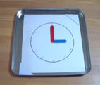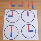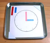 | 針に気づかせる | ![]() 同じ形の針を時計の上に置くだけ ↓ → ![]() マグネットの針を下絵通りに置く ↓ ![]() サリーが左の時計を見せて、悠くんに同じ形を作ってもらう ![]() 悠くんの方には、上下がわかるように シールを貼っています |