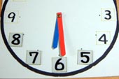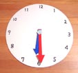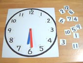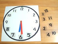 「数のおけいこ道具」に入っている時計の模型を2つ使って、1つでサリーが 作った時間を、悠くんが、真似して作るというところにたどり着くのに、針、文字盤の存在を気付かせるところから始めて、約2ヶ月かかりました。 やったーーー!!と思ったのですが・・・実際の時計が解るということにはなりませんでした・・・(^^ゞ |