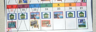 火曜日は終わったので×がついていますが『学校−大プール』『体育館』が 貼ってあります。 水曜日は『家』と『体操教室』 木曜日は『学校−大プール』 金曜日は『家』 土曜日は『家』『寝る−家×』『キャンプ場』 という事が貼ってあります。 |
