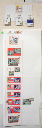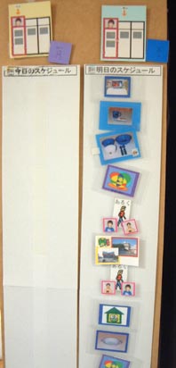 明日は学校です。 いつもは悠くんが寝ている間に今日と明日のスケジュールを貼っておくのですが、明日のスケ ジュールを貼り忘れていて、悠くんが起きている時に貼りました。 明日のスケジュールに『学校』を貼ると、悠くんが貼られた『学校』に対して「あっあっ」と何かを 訴えてきました。 何を言ってるのだろう・・・と考えていると、悠くんがカレンダーの方を指さして「あっあっ」と訴え ますので、悠くんについてカレンダーのところに行くと、悠くんがカレンダーの明日17日の所を 指差しました。 ・・・・・・・(〇o〇;))))!! なんとカレンダーでは明日は学校が休みになっています。 17日は『学校』ではなく『家』になっていました。 サリーは学校の日を休日に貼り間違えたようです・・・・ 悠くんはそのカレンダーを見て「明日は学校じゃないはず!!」と訴えていたのでした(^^ゞ 悠くんに謝りながら、カレンダーの17日に『学校』を貼りました。 悠くんは不本意な様子で「うう・・・・」と不満そうな声を出していました・・・当然ですね。 夕方に療育に行く事になっていましたので、それを貼ると、悠くんは、明日のスケジュールに 貼られた『療育』を指さしながら、「行くよね」というように何度も何度も確認してきました。 学校が休みだと思っていたのに、実は明日は学校だったという不本意なことを、「でも療育に いけるから」と思うことで一生懸命納得しようとしているといった感じでした。 ・・・またまたサリーの大失敗ですね(^^ゞ でも、こんな理不尽な突然の変更に対してでも、自分で自分の気持ちを切り替える方法を悠く ん自身が身につけてきているという感じがします。 |