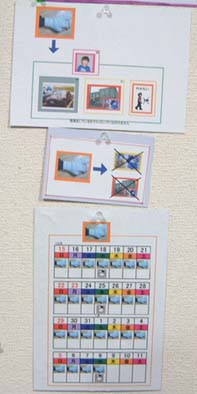 ←手を怪我しているから、悠くんは スイミングに行けません。 ←スイミングもプールも行けません。 『包帯の手』 → 『プール×』 『スイミング×』 ←包帯用のカレンダー 包帯をしていないといけない期間(4週 間程度)を示すために、4週間、包帯の 手の写真を貼っています。 |