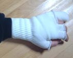 小指を固定しています。 包帯だけでははずしそうなので、指の部分を 切り取った軍手をしています。 その写真を取りました。 |