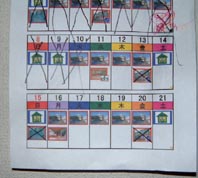 3〜4週間はかかるということですの で、その間のスイミングの予定を消し ていきます。 今日は水曜日です。 悠くんの目の前で、上記のシートを見 せながら、金曜日と日曜日のスイミン グに×をつけました。 |