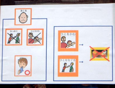 イライラしたら、制御できなくなるようです。 それでも以前のように力いっぱいということはありませんので、かなり自分で行動をコントロール出来 るようにはなっています。それでも衝動的にパッと手が出てしまいますので、「マクドナルドには行けま せん」をつけることにしました。 最初の一撃はでますが、その時にシートを見せることによって、かなり自分で抑えられるようになりま したので、以前のようにしばらく攻撃してくるということはなくなりました。 イライラした時に他傷行為をしたら、もう公共の場には連れて行けなくなりますので、そのルールを教 えていこうと思います。 |