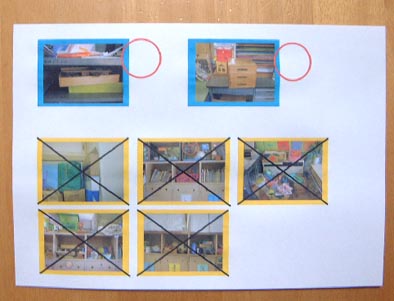 担任の先生から、いろいろな学年の教室に行って、おもちゃを持ってくるので、どうしましょうかという 相談がありました。 自分の許可されたエリア以外の物を触るのを禁止しようと思いましたので、触っていい場所とそうでな い場所を示しました。 青い枠の写真は悠くんの教室のおもちゃを置いてある場所の写真、黄色い枠の中の写真は他所の 教室のおもちゃを置いている棚の写真です。 先生にお願いして、悠くんに伝える時に使ってもらうことになりました。 |