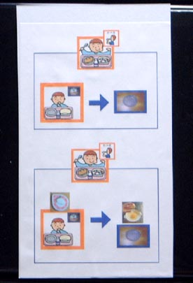 悠くん、食事を楽しみません。 好きなものがほとんどないというのでしょうか・・・ 給食を楽しみにはしません。 家でも食事を食べることは食べるのですが、2時間ぐらいかかります。 食べたいと思わないので、自分で食べようとしないという感じでしょうか。 それでも、全部食べたらご褒美という動機付けをして、時間がかかっても自力で全部食べるようには なっていますが、食べなくても平気なの?と思う時があります。 最近、食欲が落ちています。給食をほとんど食べないで帰ってきたのに、おやつの要求が出ないで遊 んでいて、おやつに誘うと拒否したりということが出てきました。 先日、担任から「中学部になったら給食の時間が短くなります。どうしましょうか・・・」と相談されまし た。 食べないならさっさと片付けてしまって・・・ということも考えられますが、それをすると、昼食は食べな いで1日2食の生活になってしまいそうで怖いです。 今までは、時間がかかっても、とにかく出されたものは全部食べるということを目標にしてきました。 でも、そろそろ時間制限が必要な時期が来たようです。 時間がかかっても「全部食べたらご褒美」という今の状態からに、「時間内に食べたら、さらにご褒美」 に変えることにしました。 「何分以内に食べたら」なんて、写真や絵で書いて伝えるのはものすごく難しいです。 悠くんは、絵は解りますが理解していません。 とりあえず、家でその状況を理解させてから、それをシートの形で表して、同じことを表しているという ことをインプットしました。 悠くんが理解できた状況に絵カードをくっつけていくという方法を取っています。 悠くんの能力では、絵から読み取るなんてことは不可能ですから・・・(^^ゞ |