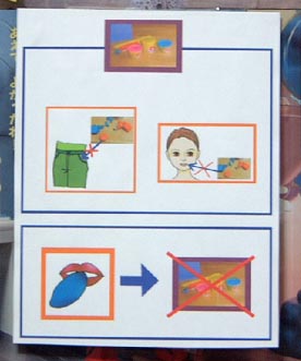 2度ほどルールを目の前に示して粘土遊びをさ せてみましたが、失敗しましたので、粘土遊びを 禁止しました。 悠くんが不安定な時期は、イライラした気分を落 ち着けるために、口で物の感触を楽しむというこ とが強くなります。その時期に粘土を見ると、口 に入れたいという衝動の方が強くて本人には抑 えられないようです。 解っているけど抑えられないという感じです。 ルールを視覚的に示しても効果はありませんで した。 粘土遊びをすると結局口に入れてしまって叱らな くてはいけないということになりますので、口に入 れたい衝動が強い時には粘土遊びをさせないこ とにしました。 落ち着いている時期には、粘土を口に入れると いうことをしません。 |