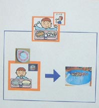 家庭版のお約束を応用して、学校版を作りました。 「タイマーが鳴るまでに全部食べれたら、セラピー室に行けます。」 悠くんがちゃんと出来たら、給食の後、セラピー室に連れて行ってもらえます。 |