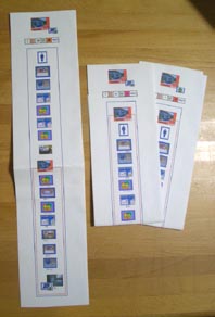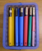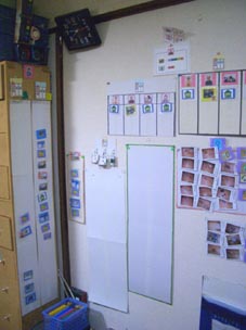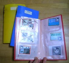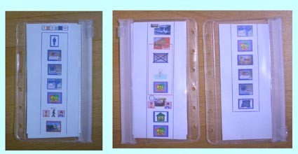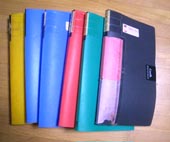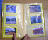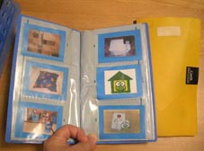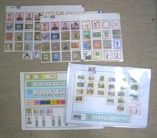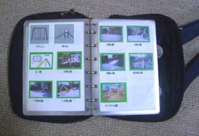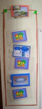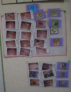 |  赤いファイルは病院や学校といった、 悠くんが自由に選択できないものを 入れています。 悠くんには選択権の拒否権も 与えていません。 緑は、ちょっとしたお出かけ先。 近所の公園とかです。 紫は、家の中での遊び、 粘土やビーズといったカードです。 ピンクは、人物のカードです。 |  黄色いファイルは、休日のお出かけ先 です。 プールやマクドナルドはこの中に入って います。  青いのは、身辺自立関係。 食事や歯磨きといったカードです。 | |