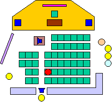 緑:座席、薄紫:参加者立ち見、茶:ステージ、濃茶・薄茶:机、青:機材、桃:@manbow垂幕、