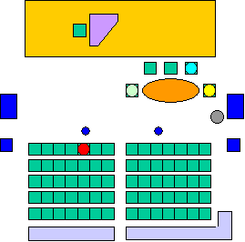 緑:座席、薄紫:参加者立ち見、茶:ステージ、濃茶:机、青:機材、紫:ピアノ