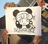 [ 撮影会? ] 急遽、撮影会を行いました。そう、しあわせ観光の旗の(^_^) ガラス工房から出た後、知人が 「しあわせ観光の旗、撮影してもOKと言われたので、今、借りています」 と教えてもらったので、知人の後を追いながらちょっと離れた場所へ移動。 私も!という事でいつの間にか人数が増えてました(^_^) 「お姉ちゃんの方にカメラを向けなければOKです」との事だったので、 喜っ子さんから離れて背を向けて撮影会開始〜 実際に撮影したのは7名程? 最初は旗を撮影。その後、集合写真や個々人のバストショット等を撮影しました。 ※写真中央:顔を旗で隠されているのが私です。気がついたらやられてました(^_^;)