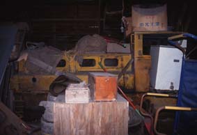 ありました。一応屋根の下にいるので状態はよさそうですが、豪雪地帯のこと、この崩れそうな建物はどれくらいもってくれることでしょう。それにしても小さくて愛らしい。譲り受けて家で保存したいけれど、輸送料はどれくらいになるものなのでしょう。鉱車はほとんど放置されておりますが、樹木が邪魔して写真になりません。車庫跡をのぞくと、予備であったDLもそのままになっておりました。こうなってしまうと撮影のしようもなく、一通り足早にスナップして岩泉を後にしました。残ったものはスピード違反の青色切符と後悔のみ。ただ、この時の悔しさが、1カ月後の屋久島行の原動力となるのでありますから、まんざら無駄ではなかったのではありますが・・・。
