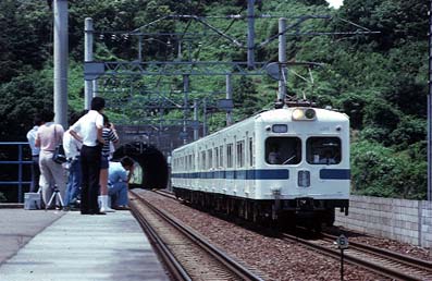 小田急の通勤型では最後に残った2枚窓車で好きであった。最近(H11.11)相模大野に保存されていた2両が、青と黄色の旧塗装に戻されて展示されているのを雑誌で見た。なかなかいい感じであるが、自分のなじみはやはりこの写真の塗装である。小田急の電車は何故か2灯ライトの片側のみ点灯なのだが、どういうわけなのであろうか。以前理由を知った気がするが、また忘れてしまった。小田急電鉄はこのような価値を認めた車両をユニットで保存している。これは大変なことであると思うのだが、我々にとっては有り難いことで涙が出る。NSEなども1編成丸々保存と聞いているが、それが本当なら、自分が棺桶に入るまでにはもう一度この車両をはじめ、SEやNSEの雄姿を撮影できるかもしれない。これはとても楽しみなことである。