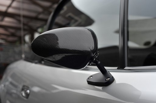 ティアドロップ形状がNAのデザインに予想以上にマッチ。このミラーは見た目だけじゃなく、ノーマルミラーには劣るけれど視認性も高くて十分実用的。ヴィタローニの悪魔的な視界に慣れてたので、この視界は感動的。 ![]() カーボンパーツって目立つのでブラックに塗装してから使おうと思ってたんだけど、取り付けてみると違和感なくマッチしたのでこのまま使ってる。紫外線で色褪せたら塗ればいいやね。...だけど既にスペアを手配済みだったりもする(^^)