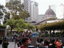 | 5日目は...朝から雨でした。でも出かけました。なにしろ今日が最後ですから。 でもそんなにひどくなるとは思いませんでした。 日曜日なので、お約束(?)の中環見学。結構雨だったのですが、やはりアマさん 達は集まっていました。雨をよけるためにホンコンバンクの1階にみんな集まって おしゃべりしてました。遠くからだとまるでビルがしゃべっているような... それから上水へ。私はなぜかここがお気に入り。といっても駅前半径1kぐらい しか知りませんが。あとは沙田を経由して市内へ戻ってふらふらしていました。 夜になって結構風雨が激しくなってきたのですが、信和中心とか旺角をふらふらし てから、廟街へ....さすがに露店はでていませんでした。 真っ暗な廟街というのも初めてみました。 ホテルへ帰ってきたら風球3号の警報が出ていたことをはじめて知りました。 |