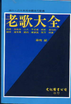 40-60年代中国流行歌曲 老歌大全 これは香港で買った、いわゆる歌本というもの です。この手の歌本は昔から沢山あったよう ですが、これは古い流行歌曲を集めている ところが一寸珍しいかもしれません。 全部で300曲以上の古い歌が収められて います。ただし版が小さいため歌詞はすべて 一番だけです。また楽譜は中国で一般的な 数字で音符を表す方法をとっているため、残 念ながら私も読めていません。(この表記法 について詳しくご存知の方教えてください) 印刷は悪いですが所々に写真も入っています |