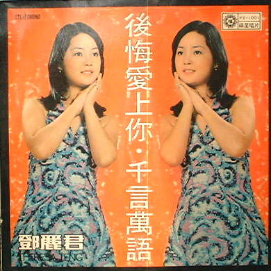 | 次は「後悔愛上「イ尓」」というレコードです。 これは福星唱片という会社から発売された ものです。この会社についてはまったくわか らないのですが、ジャケット表面がきちんと コーティングされていることから、香港かシン ガポールあたりの会社ではないかと思われ ます。ジャケットをご覧になっておわかりに 成るように、「海韻」の写真と同じ物を使って いるところから、1974年以降の物かとも見 えますが、バックの模様の雰囲気は73年の 「少年愛姑娘」のようでもあり、微妙なところ です。 |