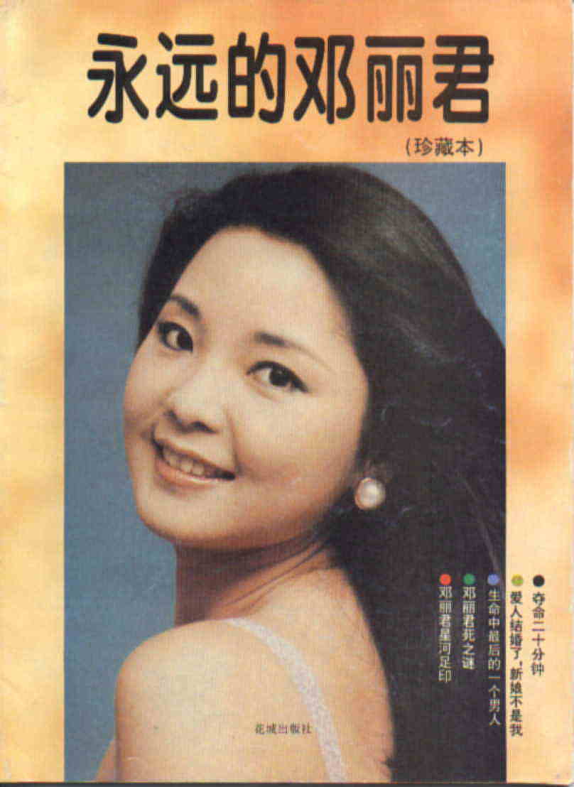 | 写真集も少し。 左は「永遠的ケ麗君」という題名のムック的な本です。なくなった直後に出版され ています。 見たとおり大陸で出版されたものです。(花城出版社という広州市の出版社です) 写真も結構入っています(画質は悪いですが)。 やはり大陸でも彼女の死は非常な衝撃をもって受け止められたことが、亡くなった 月に出版されていることからもわかります ただし、非難ごうごうだった最後の写真も入っています。 ある部分日本の報道とかと感覚が違うという部分もあるのですが。 やはりここまでしなくてもという感じです。ただそのほかの写真には、あまり日本 では見られないような写真もありますので一応ご紹介いたします。 右は昨年香港で行われた「漫歩人生路」の記念写真集のようです。 こちらは記事等は無く、カラー写真がとても綺麗なものです。 これを見ていると、亡くなってしまったのが信じられないような気がします。 |