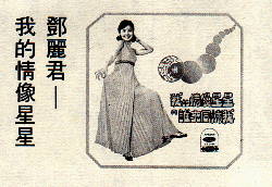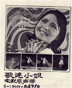 | ここからは香港の音楽雑誌に載っていた広告を紹介します。 まず最初は映画「歌迷小姐」のEP?です。 これは1971年の5月のEMI香港の広告です。 残念ながら白黒なのですが、はじめてみる写真です。 レーベルはEMIリーガルのようです。 音そのものは一応香港EMIがCD化しています。但しセット ものの中の一部分なので、入手はしづらいかもしれません。 最近VCDで「ケ麗君成名史」という題名で売られているもの のオリジナルサウンドトラックなのですが、一部アレンジなど が異なっている部分があります。 |
