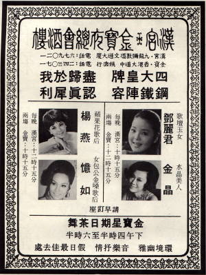 | 次は夜総会出演の広告です。 1971年の秋に出演した時の広告のようです。 日付がありませんので、少なくとも10日から半月程度は出演したのでは? 漢宮は九龍、金宝は香港島にそれぞれあって、ショーは毎晩10時15分と 12時15分!からでテレサは10時15分の回は漢宮、12時15分の回は 金宝に、楊燕はその逆で出演していたようです。 |