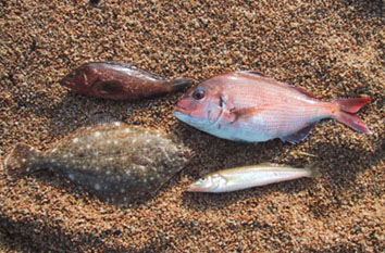 | マダイ 41cm イシガレイ 37cm キス 27cm |