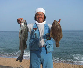朝まずめに最後の期待をかけるが、マダイやスズキは不発。唯一、スズキ狙いの青イソメを房掛けにして遠投した竿に37センチのイシガレイが釣れた。これを最後に午前7時納竿、丹後半島をあとにした。