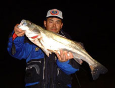 昨晩は8時頃からアタリが出だしたらしい。回遊時間はさほど変わらないだろう。私はK氏と地元釣り師の間に入れてもらって竿を出す。真っ暗な浜に、緑色の竿先ライトの光が点々と浮かびあがり、満天の星空と相まって幻想的な光景を創り出している。