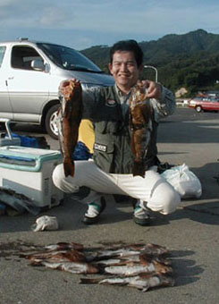 | 木下氏とアイナメ | K副会長氏の初日の釣果 | 竹内氏とナメタガレイ |