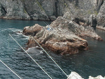 船は断崖が続く絶景とでもいうべき海岸線を見ながら軽快に航行していく。船長の声にふと目を見やるとなんと断崖の上から竿が出ているではないか。いわゆるクレーン釣りというやつだ。どうみても海面から釣り座まで30メートルはあるだろう。
