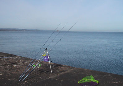12:30 食事を取りながら。見事に潮がヨレている内向きについての雑談。「内向きもええかもね」とのばんちさんの一言に、一服状態の外向きの竿のうち3本を内向きに投入する。