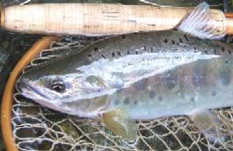 | で、翌々日、切ってそろえて同サイズがチラホラ釣れました。 久しぶりにニンフもやってみましたが、こちらは反応今一! ニンフの釣れる時とそうでないときって、歴然としておりますが、 こうゆうことってのはやはり虫でしょうか?月の影響?、、不思議なもんです。 ついついドイブへ突入すると、(初めてのポイント)、ライズだ!!! というわけで、釣れたのはバッチリ尺のイワナ君。 う〜、チョットちょっと、違うんですよね〜〜〜あはは、面白〜イなあ;; |