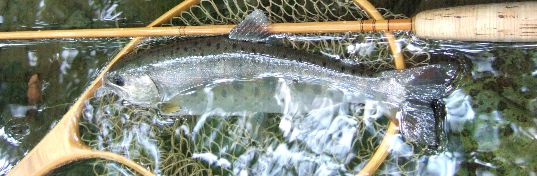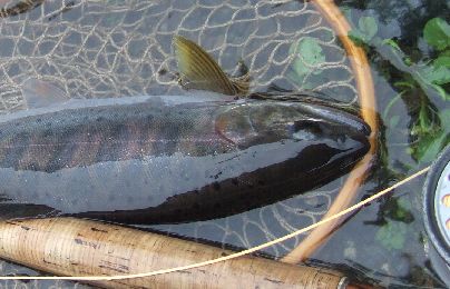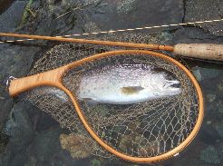 | 一応、ゲットであります。 どんどん雨も強くなり、状況は悪くなること必定。 後は流れに任せ、川を彷徨うわけですが、こうゆう時こそニンフであります。 しかーし!今一です。 あらゆる場所を試しますが、どうもおかしい。 この状況は相当良いはずなんだが、なにが起こっているのかなあ〜 |
