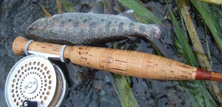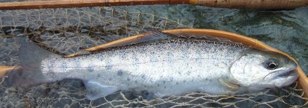 | 翌々日には1km程を叩きに叩いたが、ノーヒット!! 汗でグジャグジャ、レロレロになる。 で、最後のポイント(ssts)でヒットしたが、3段下ってのファイト、 ランディング寸前にブン!! とバレタ!! 「うっそ〜〜〜〜」と叫んだ。 |
