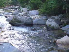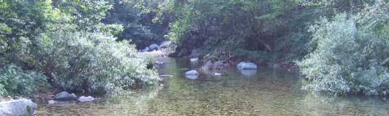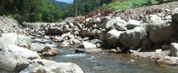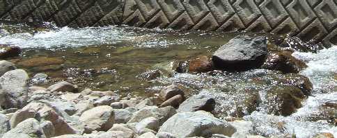 | 川に付くととりあえず、笛を吹きまくります。 リラックスが少々スポイルされますが、釣ります。 さっそく上(写真)のポイントで9寸がでた。 さいさき良いぞ。 |