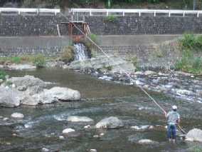 | 翌日は¥氏、moto氏、ヒロリン氏と ジュニア達のBBQにお邪魔して アユ釣りをすこしだけしましたが、 しかし暑い!! 移動先を検討した結果、この暑さが 飛騨に戻ることを要求、決定。 なかなかのドライブでしたが、 それも結構楽しいものです。 |