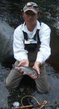 | 今日はkiku氏もお出ましになります。 しかし、私、寝坊をしまして6時起き。ヒャー! 一時間遅れて現地に着くと、kiku氏はすでに28をゲットのこと。 さーって、では私はノンビリ、ニンフで参りましょう。 今日は基本的にニンフデーのノリで行きたいと思います。 ペタコン、ペタコンと、楽しい楽しい。 ニンフの釣りは、もう、やればやるほど好きになってまいりました。 なぜかって言うのは、それは、理由はいっぱいありますよ。 まあ、アグレッシブでダイナミックだってとこかな。 とにかく大好きになっちゃいました。 |