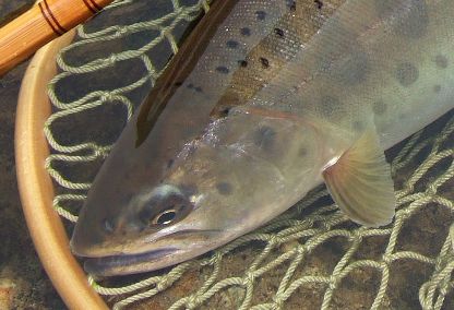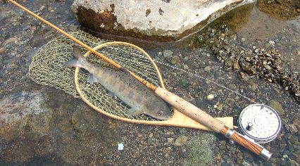 | また違う日には、朝一で一尾だけのライズがあって、 遠くから眺めながら”う〜ん”と、戦略をねって釣ってみたというやつです。 あっちへ渡って、こう回ってそっち側へ立って、コウ流すのが 良いかな、、、 でも、、意外と渋そうなんで、やっぱりベストポジでないと出ないか スプークか、スカすかで終わりになりそうだし、、、と楽しい楽しい。 |