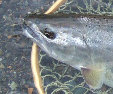 | と、KKに連動した(多分)ライズを発見。 ウエイディング。 ほぼ真横からアプローチをして、、、、 コイツは若干左右にフィーディングレーンの幅を持っているが、それは約20センチ位。 上下的に2m程の中でライズしています。 そのライズエリアに向かって手前50センチ、30センチ、10センチ、、、 メジャーリングでドリフトするフライを近接させてまいります。 で、エリアに突入!!とりゃ! フライが着水し、白いCDCのインジケがフワフワ、10センチも流れたか、、 チョピ、ボコボコボコ! うお!ヒット!でかいか!?うん? いや、それほどでもないか、、うん? わからないぞ。 とにかく、限界テンションと、時間による糸の劣化、肉切れ進行、 等のクロスポイントを維持してファイト。 流芯でブルブル、下流へビュー!上流へゴンゴンゴンと逃げ上る。 そこでのランディングをかわされ、も一度下流へ下ったのを ゆっくりと顔を引き上げながらランディング。 |
