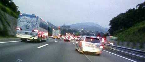 | 高速道路での渋滞、正面の山裾に巨大な”人工ー天然偶然オブジェ”? が見えてきます。 ”戦艦”です。 見れば見るほど、そっくりなんです。 |