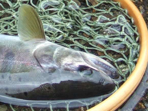 | 唯一のポイントに良いサカナが居るのですが、どうしても 釣り上げることができません。 今年、そこで3回掛けていますが、全部バレキレを食らっております。 その1:久々に手ごたえ充分、走りまくるヤマメを落ち着いて追っかける。 10mほど下って、川岸に寄せていたら、そこにズタブクロが!! 逃げ場を見つけたヤマメがそこに突入。 ズタブクロにリードフライががっつりフッキングし、6xの先の ドロッパーとともにブチン! その2:前回と全く同じスポットでフッキング。 今回は走らせまいと、出来るだけ止めていたら、ブチ! その3:今日はやや増水気味で前回、前々回のスポットよりやや下流を 狙うと、一発!! グイーンと走り、増水に乗ってしまって20mほど追いかけさせ られた。 顔をみると、「お!リードフライだ!フッキングは」 よーし、今度こそと、慎重に寄せるが、元気で元気で なかなかよらない、、、、ついアセッテネットで強引にすくったら ツルリと逃れて、ネットにドロッパーがフッキング!! プイン!!とあっというまにゲイプを引っ張られたリードフライが お口から外れた。 汗がドドドド!っと出て来た。 「はあ、はあ、はあ、はあ、はあ、はあ、はあ、、、ぐっそ〜;;」 |