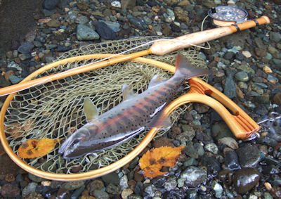 | 色ずくヤマメと落ち葉、この組み合わせはなかなか味わい深いもの なのですが、同時に釣りも急かされるような気持ちにさせられます。 禁漁間近なんです。 ライズの釣りが好きなのですが、難しいですね、何年やっても。 今年は特に大変だった。 しかしこの日は比較的恵まれていたんです。 |