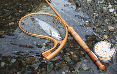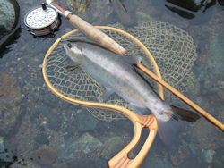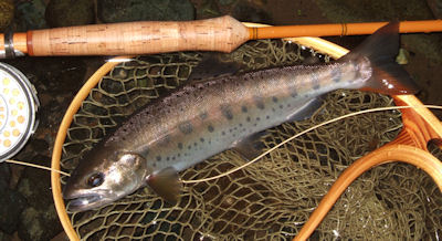 | というわけでフライをイロイロ変えて、最後にSPCを結んで, トリャ!と投げたら、 サカナと岩盤の間の水面に、たまたまスポッ!!と着水。 そしたら、このおサカナ、スット来て、パクっと喰った!! ガボガボッ、ギューン。 川に入ってファイトです。 岩のえぐれや、底石に向かってゴンゴンキリキリ突っ込む突っ込む。 「アレー!?なんだこれ、妙に強いぞお、9寸くらいのはずなんだが、」 おお、こんどは上流に向かって突進しだしたぞ。 あ、また下流に、、、、、、。 すったもんだの末に、やっとこ流れの筋から暖流帯へと誘導し、 サカナの顔を少しだけ上げて、じんわりじんわり近ずけて、 ヘッドファーストでゆっくりゆっくりネットイン。 |